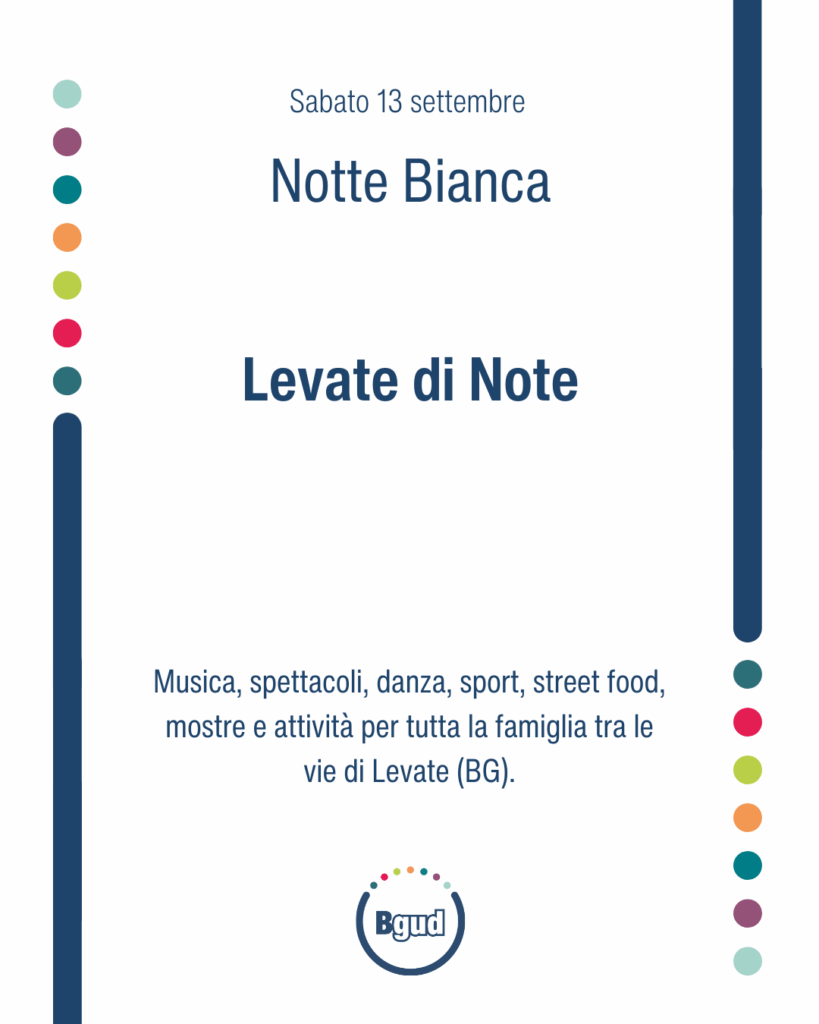 Sabato 13 settembre, Levate ospita la terza edizione di “Levate di Note”. Dalle 19:00, il programma avrà inizio con musica, spettacoli, danza, sport, street food, mostre e attività per tutta la famiglia.