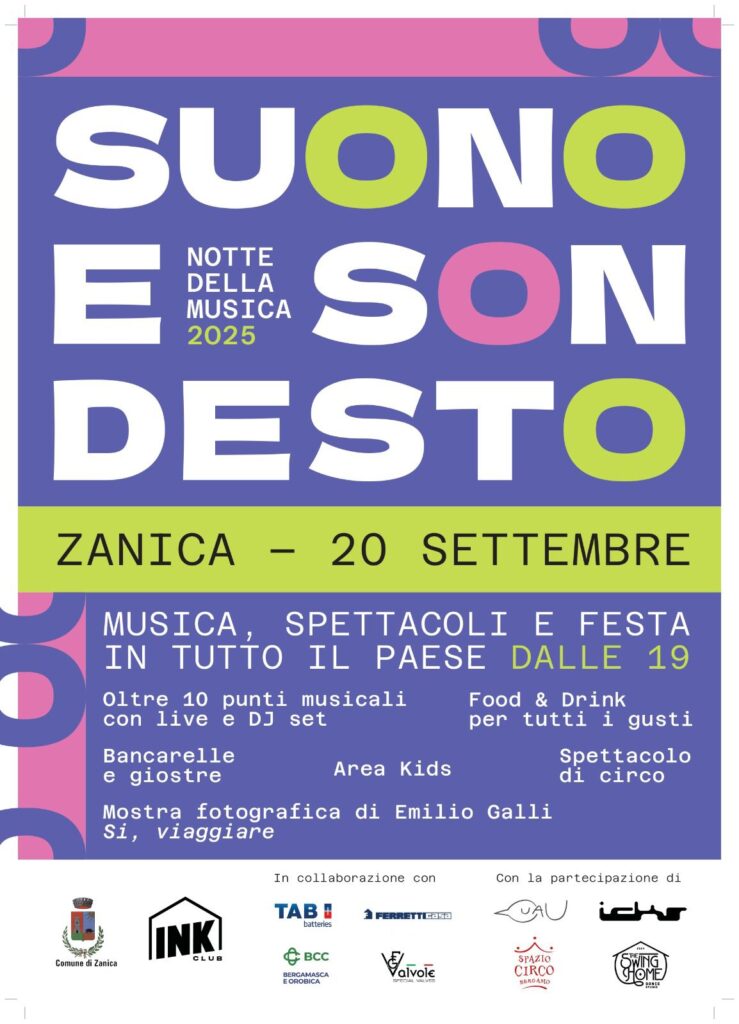 SSabato 20 settembre 2025 torna a Zanica la terza edizione di “Suono e Son Desto”, la Notte Bianca della Musica che fa vibrare il cuore del paese con musica, spettacoli e divertimento per tutte le età.